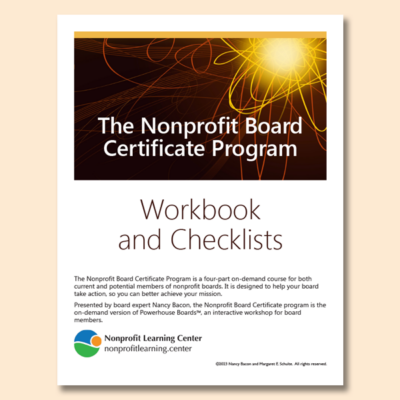 A 24-page PDF guide to creating your nonprofit’s Powerhouse Board(TM). This is a standalone download of the booklet that accompanies the Nonprofit Board Certificate Course. Also available in Spanish.